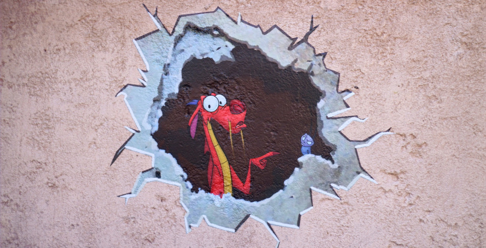 Across from L’Artisan des Glaces, the trio of kittens from “The Aristocats” can be seen walking on a ledge above the sidewalk.